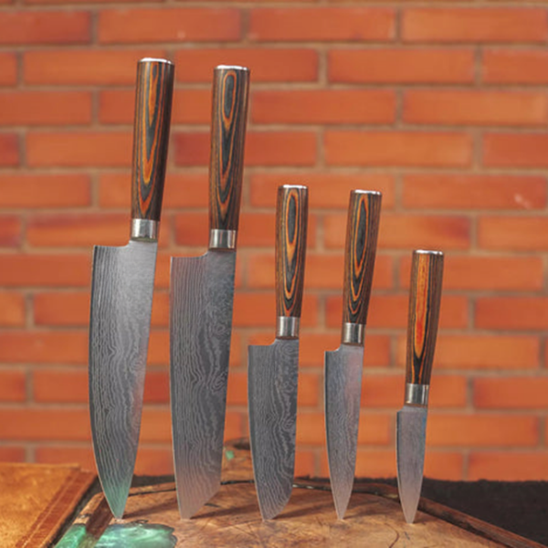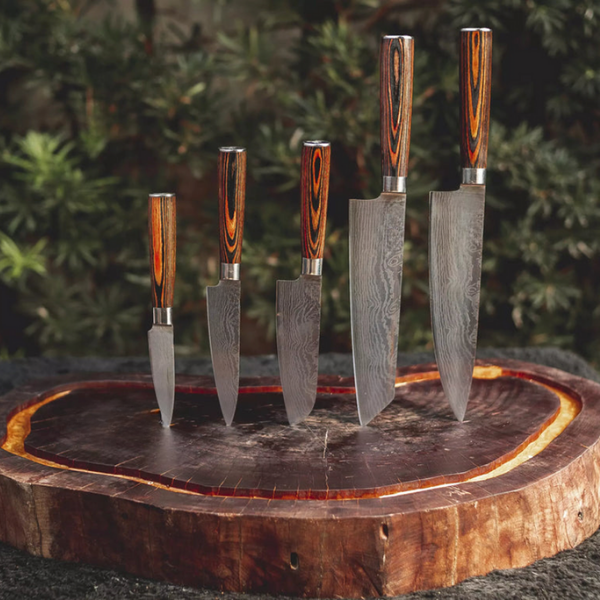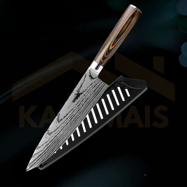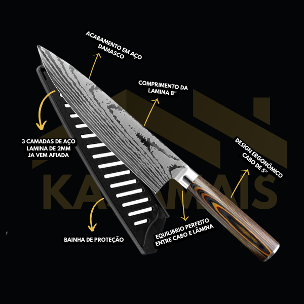 Um Kit de Facas excelente para seu churrasco e cortes do dia a por sua extrema agilidade e custo benefício, Com a Faca do Chef em acabamento Aço Damasco você garante extrema facilidade ao cortar e manusear carnes, vegetais, legumes e folhas, com um fio de Corte extremamente poderoso! E sabe o melhor? Esse fio pode ser sempre polido a estagio máximo de afiação! Uma Faca que seus filhos e netos irão usar!
